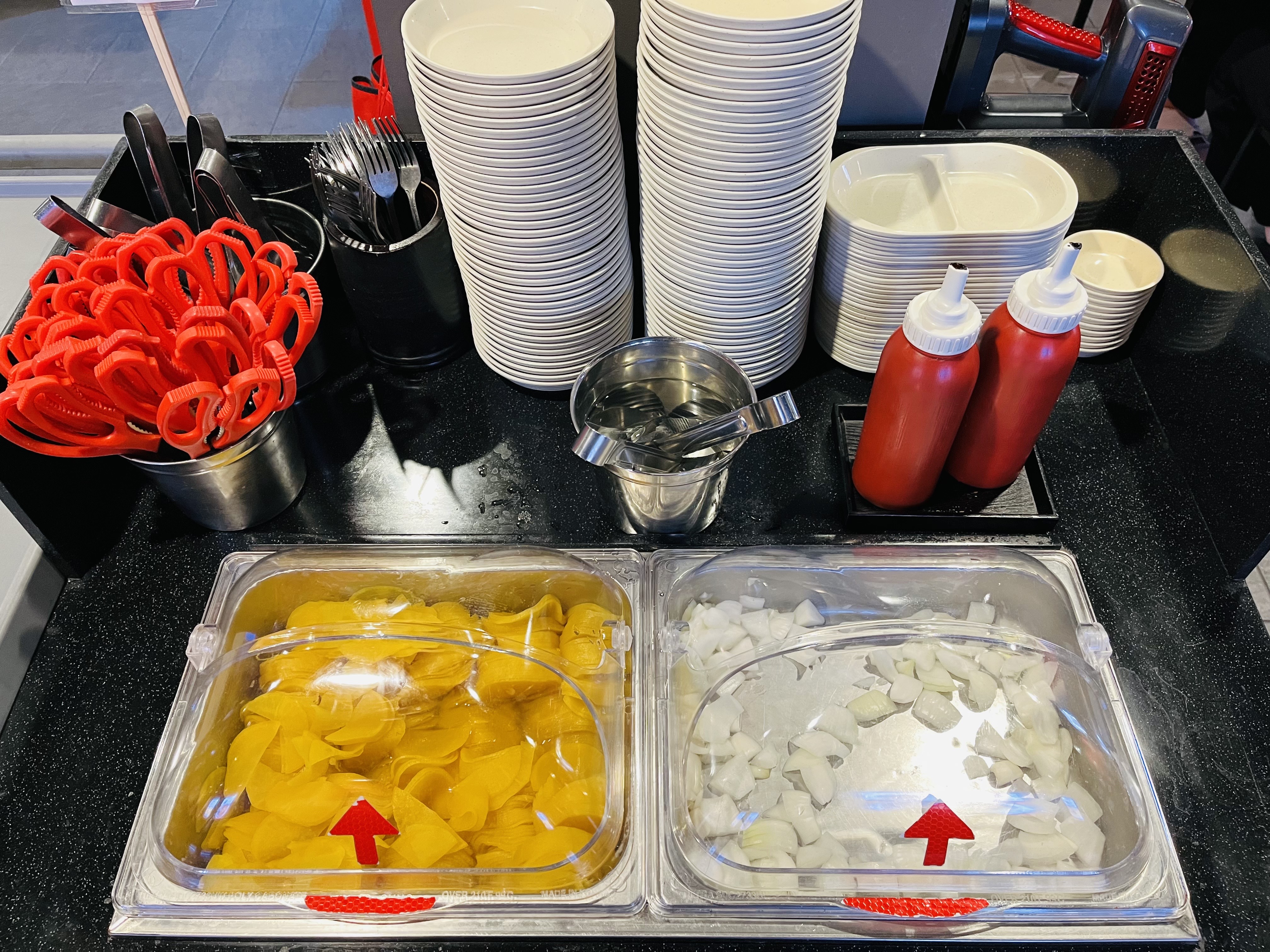 카운터 옆에 단무지, 양파, 춘장, 접시, 가위, 포크 등을 셀프로 이용할 수 있게 해놨다.