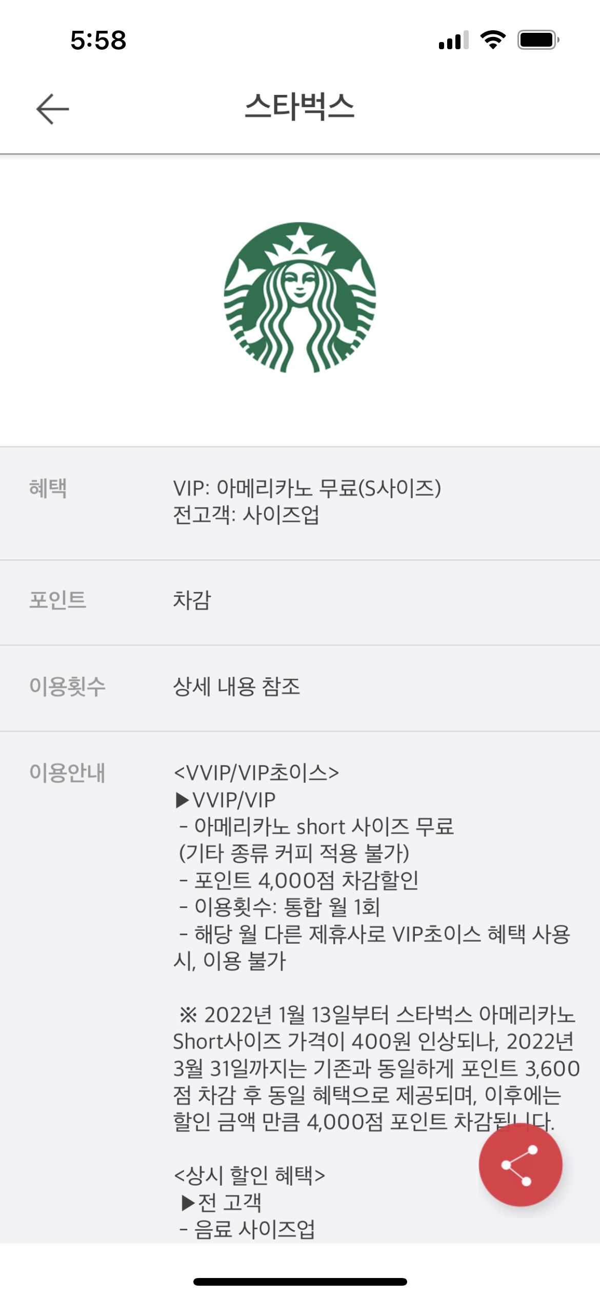 아메리카노 숏(shot) 사이즈 무료(월 1회 포인트 4,000점 차감)이다!