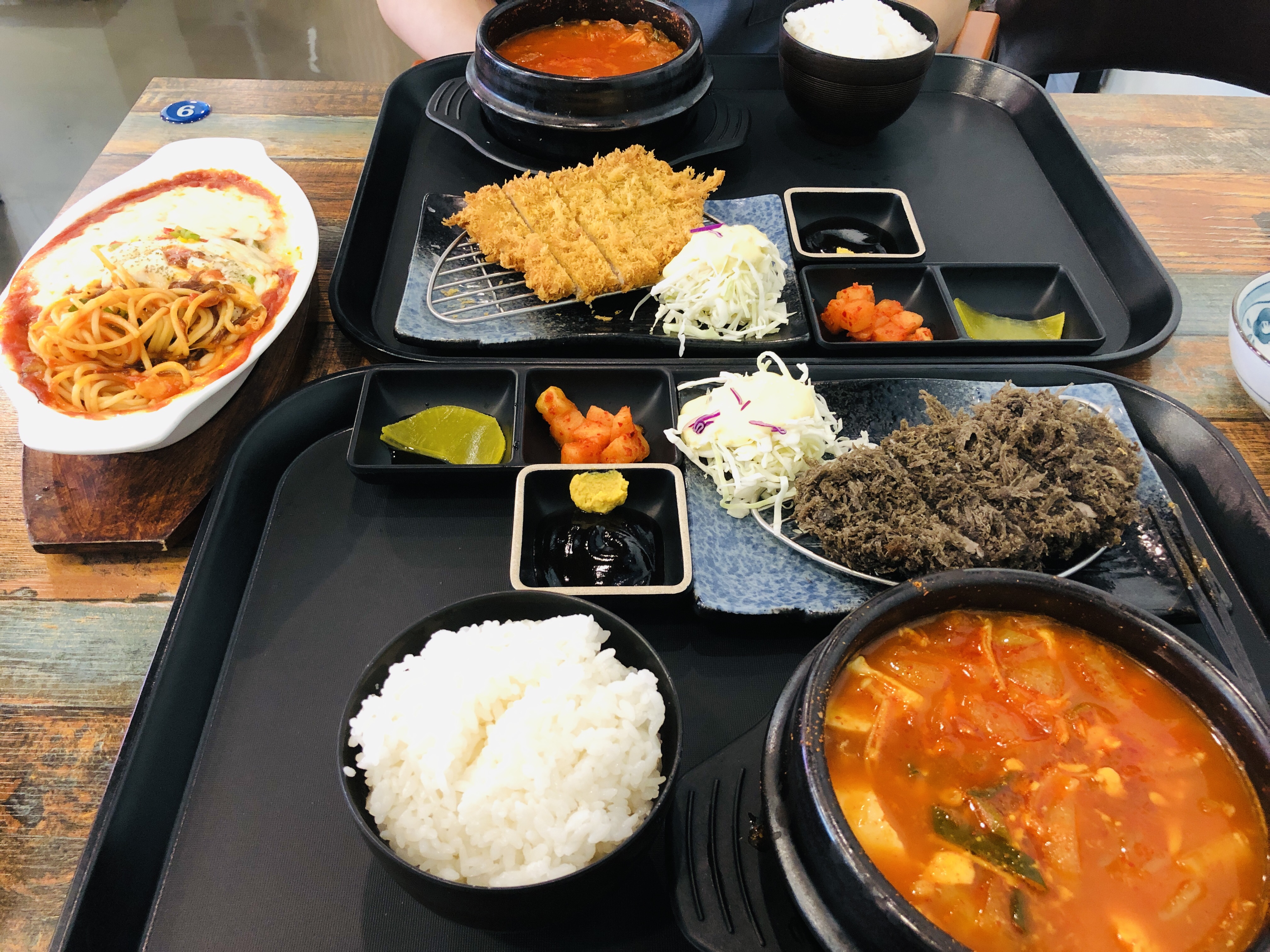 우리는 순두부찌개 돈까스, 김치찌개 돈까스, 스파게티를 주문했다.