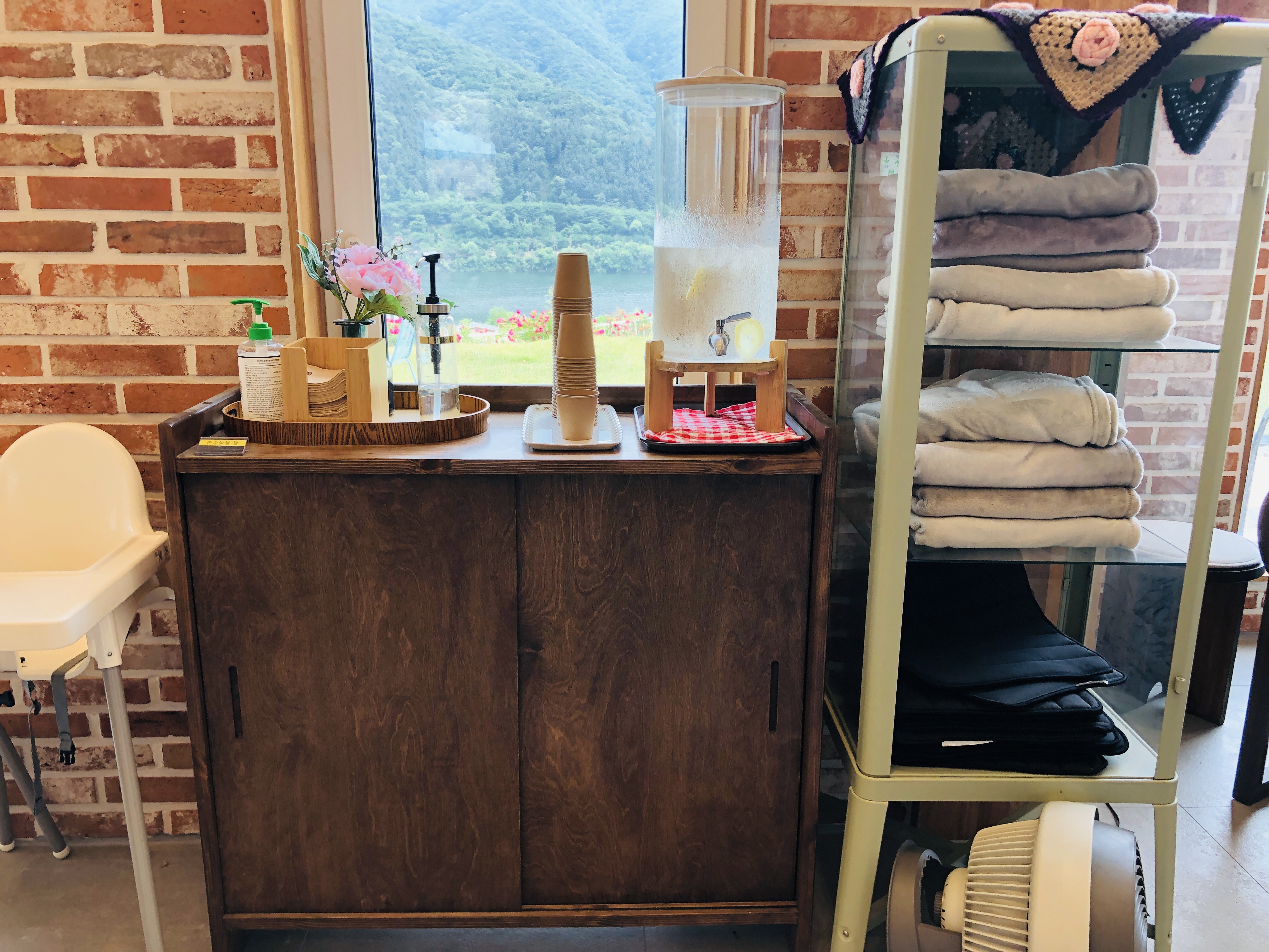매장 한쪽에는 물, 시럽, 손소독제, 담요가 별도로 비치되어 있다.