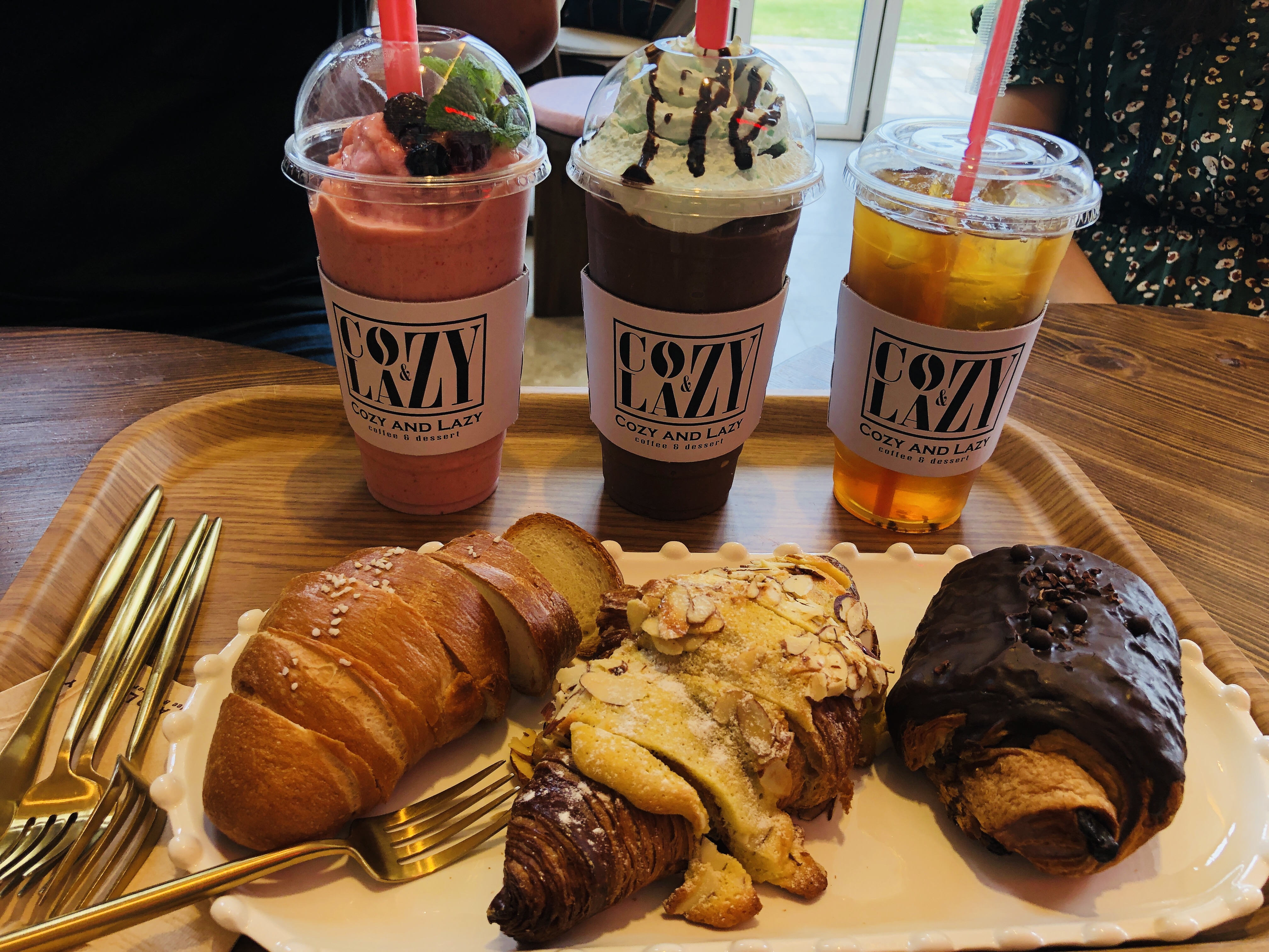 | [가평 청평 카페 코지앤레이지 주문한 메뉴 및 가격] 딸기요거트스무디 8,500원 + 민트초코프라푸치노 8,500원 + 마리아쥬프레르(마르코폴로) 8,500원 + 소금빵 3,500원 + 아몬드크로와상 4,800원 + 뺑오쇼콜라 4,800원 = 총 결제금액 38,600원 |