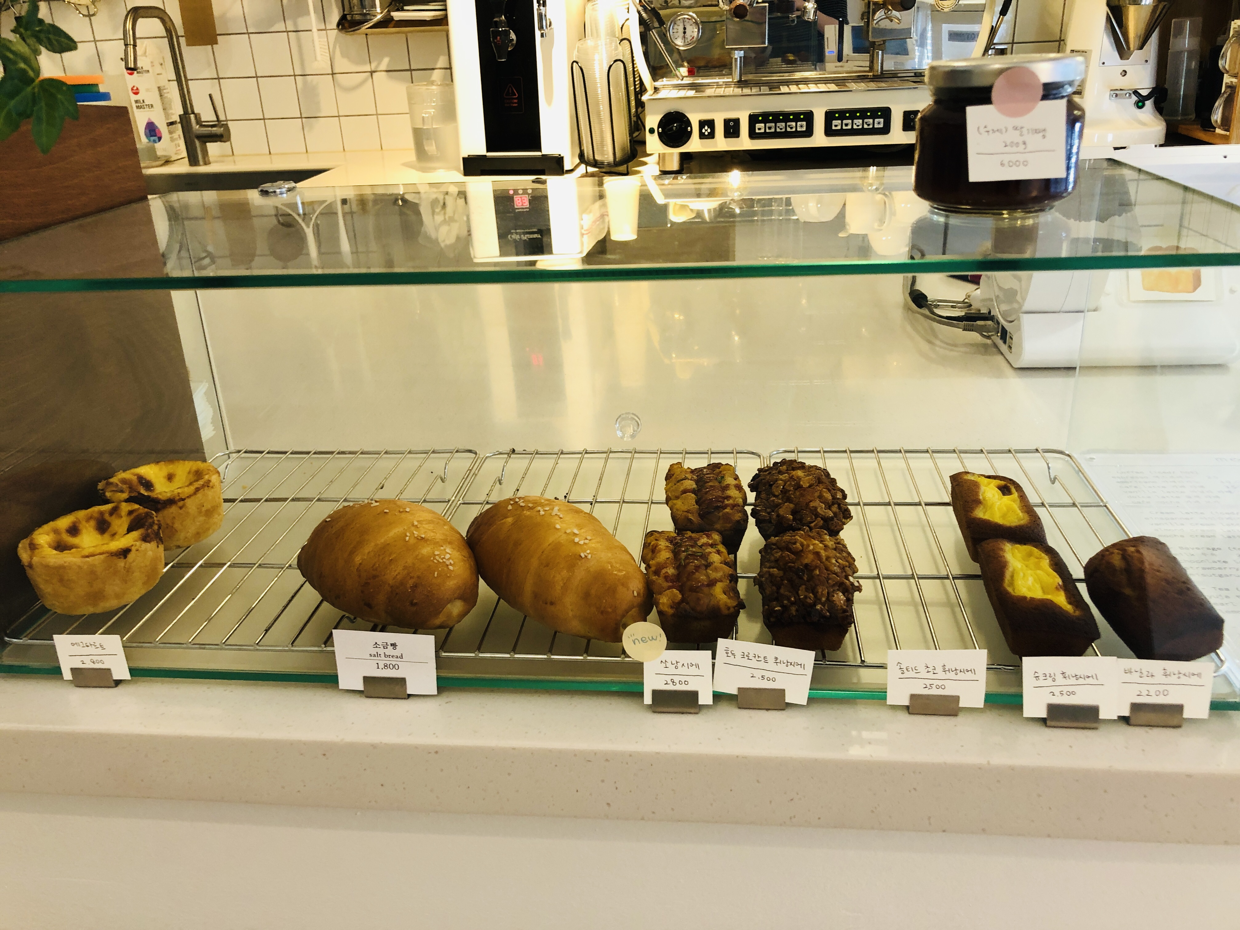 카운터 쪽에 케이크, 빵, 타르트, 휘낭시에 등 베이커리류가 전시되어 있다.
