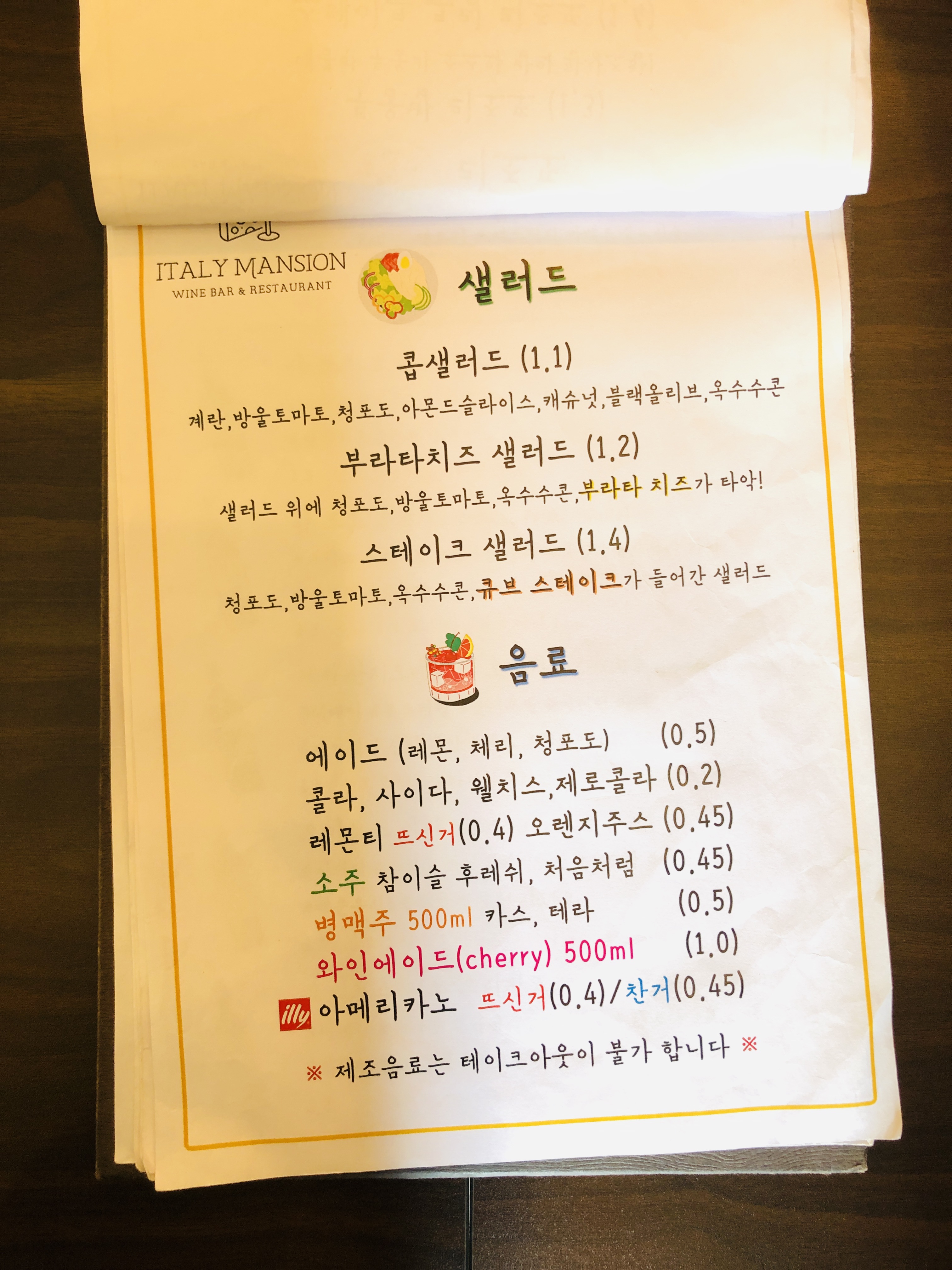 파스타, 리조또, 샐러드, 스테이크, 음료, 와인 등 다양한 메뉴를 판매한다.