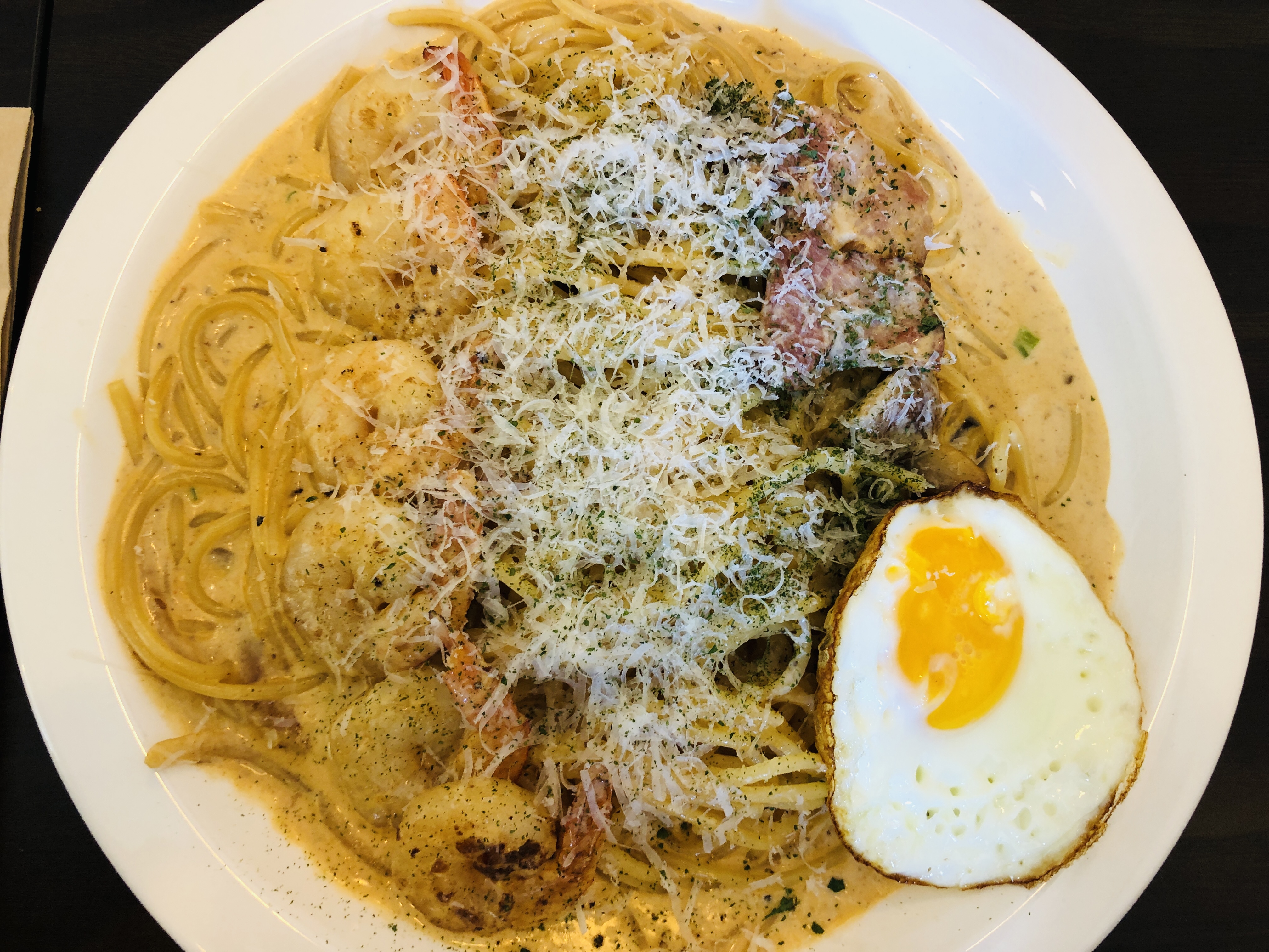 반숙 계란에 파스타 먹어도 고소하니 맛있고 ㅠㅠ 새우를 적당히 잘 익혀서인지 식감 너무 좋다.
