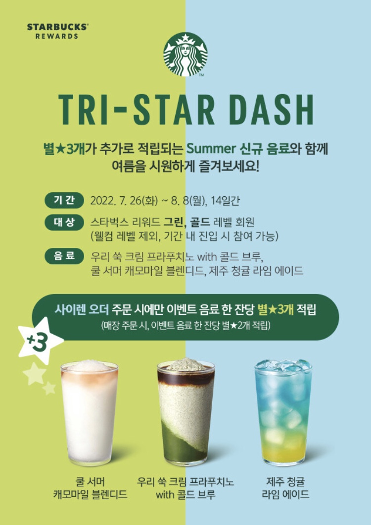 2022년 7월 26일 화요일부터 2022년 8월 8일 월요일(14일간) 여름 신메뉴 마시면 별 세 개 추가로 적립해준다고 하니,