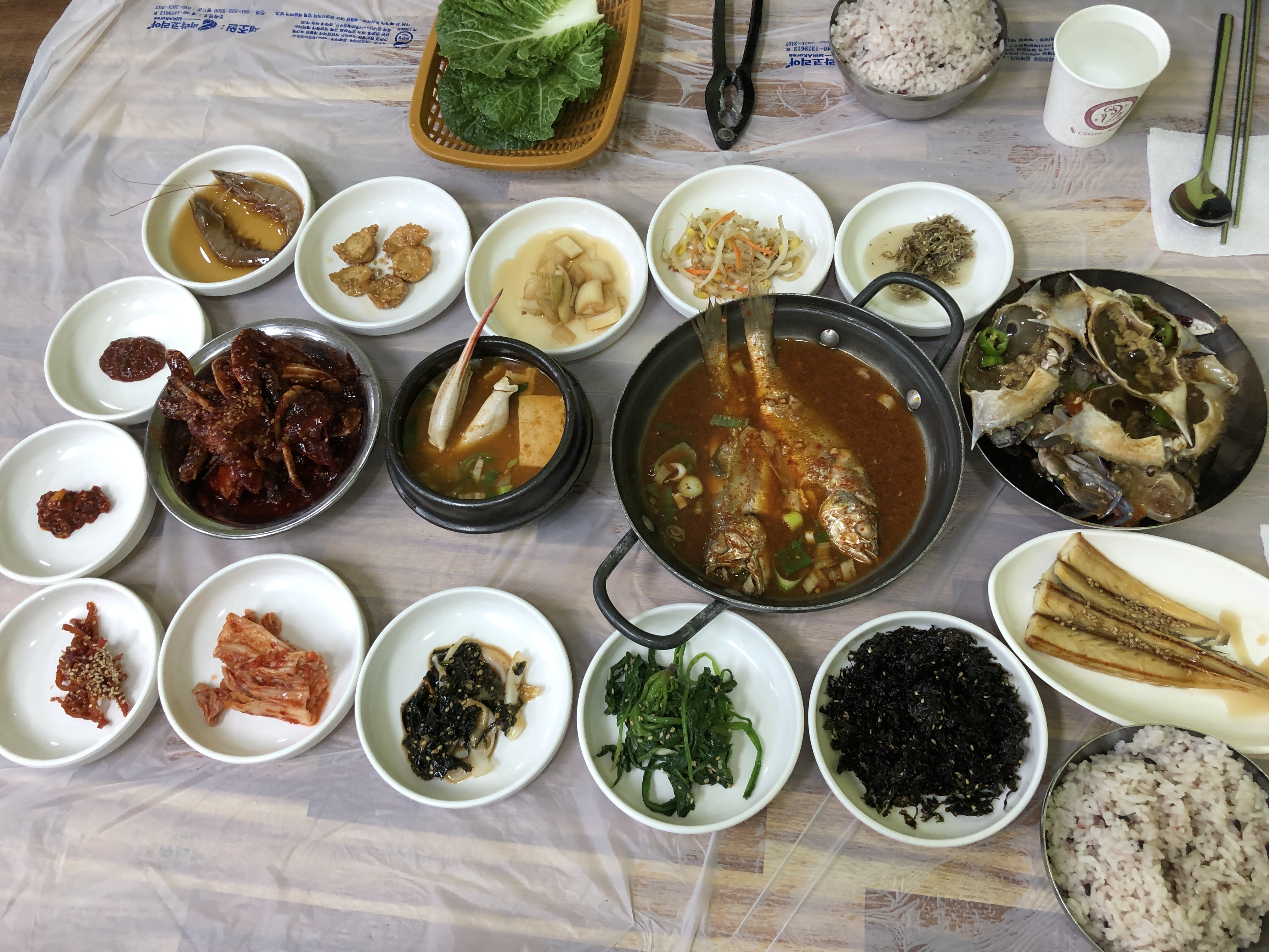 밑반찬도 엄청 다양하고 생선구이, 생선찜, 된장찌개, 새우장도 나온다.