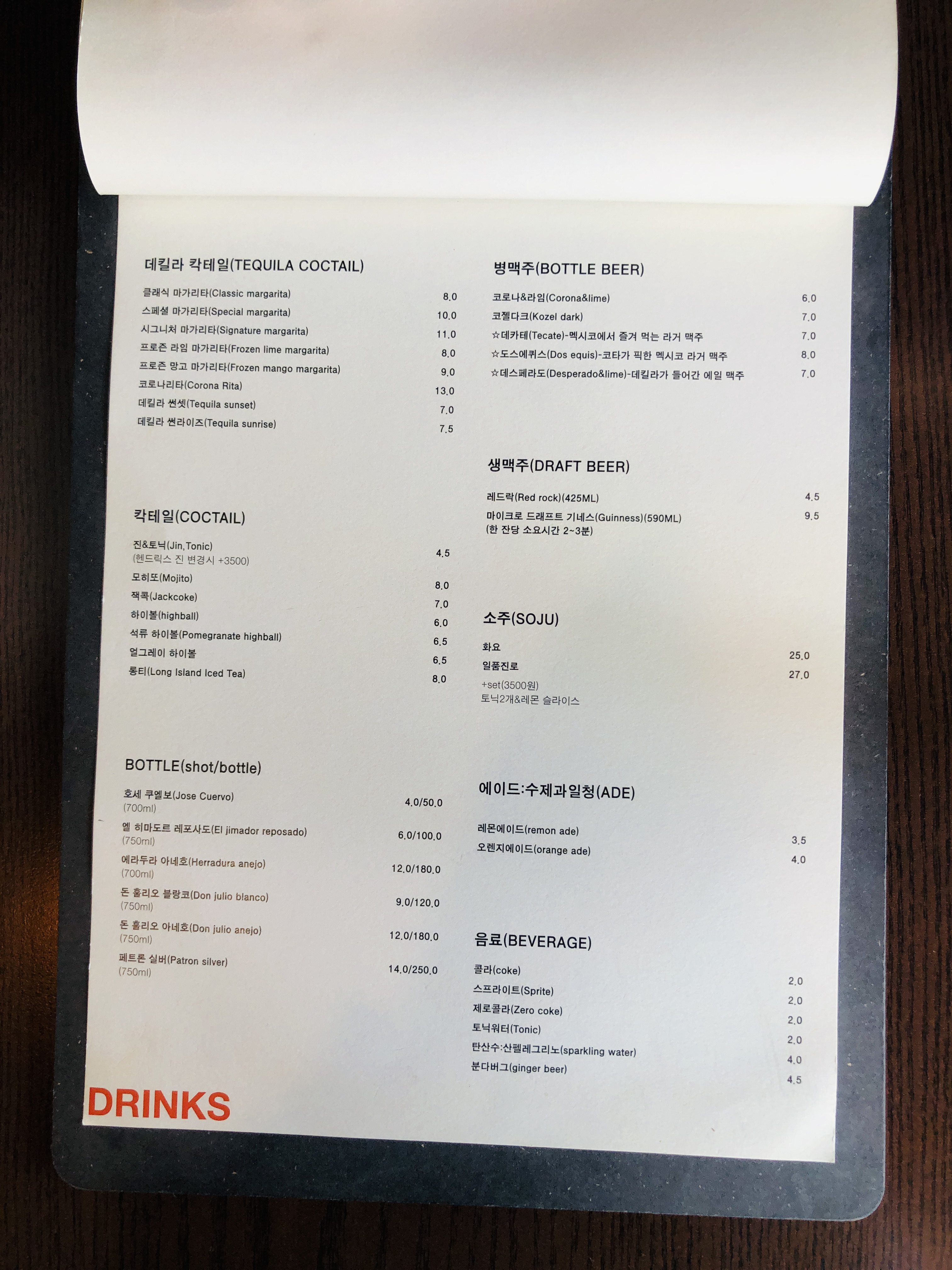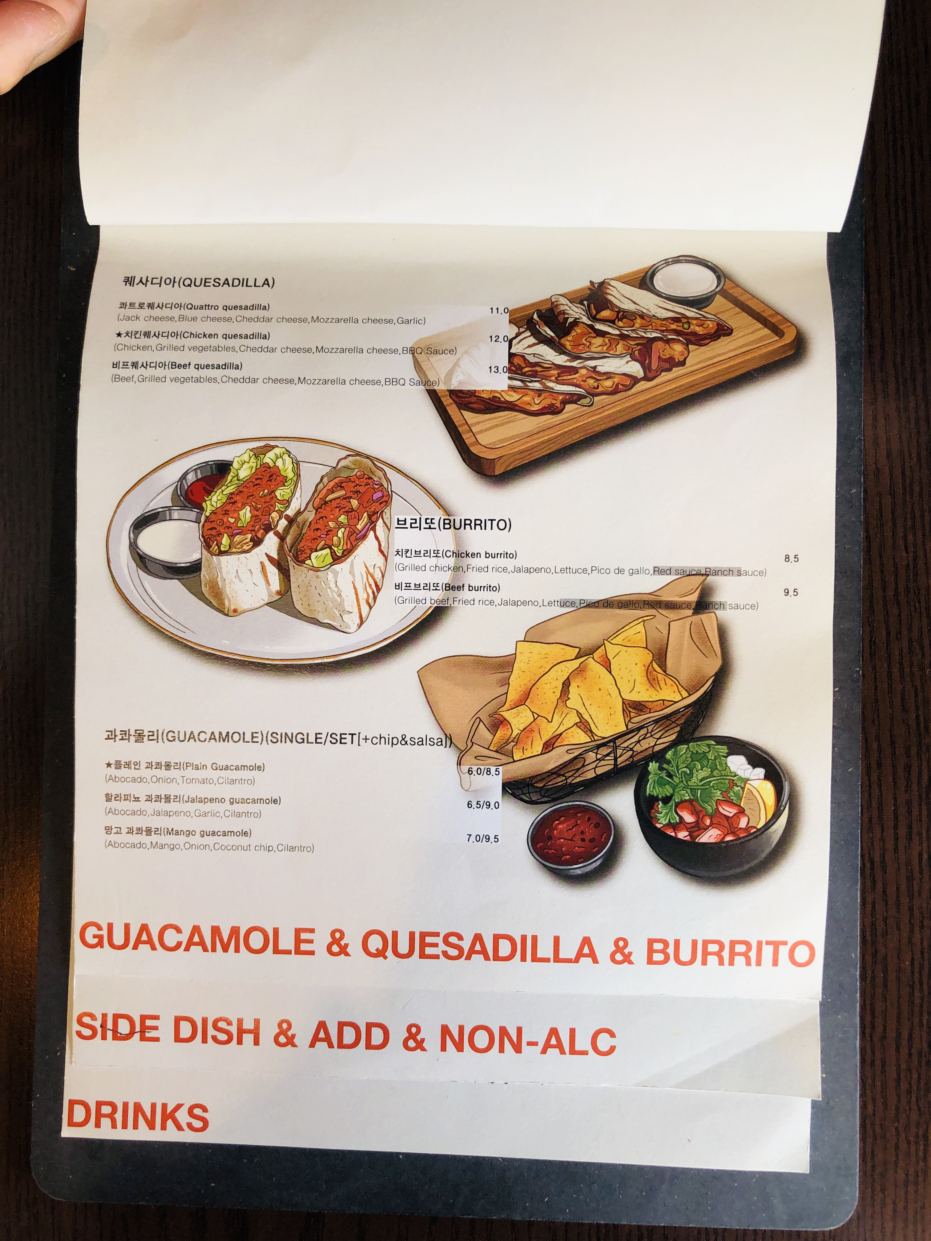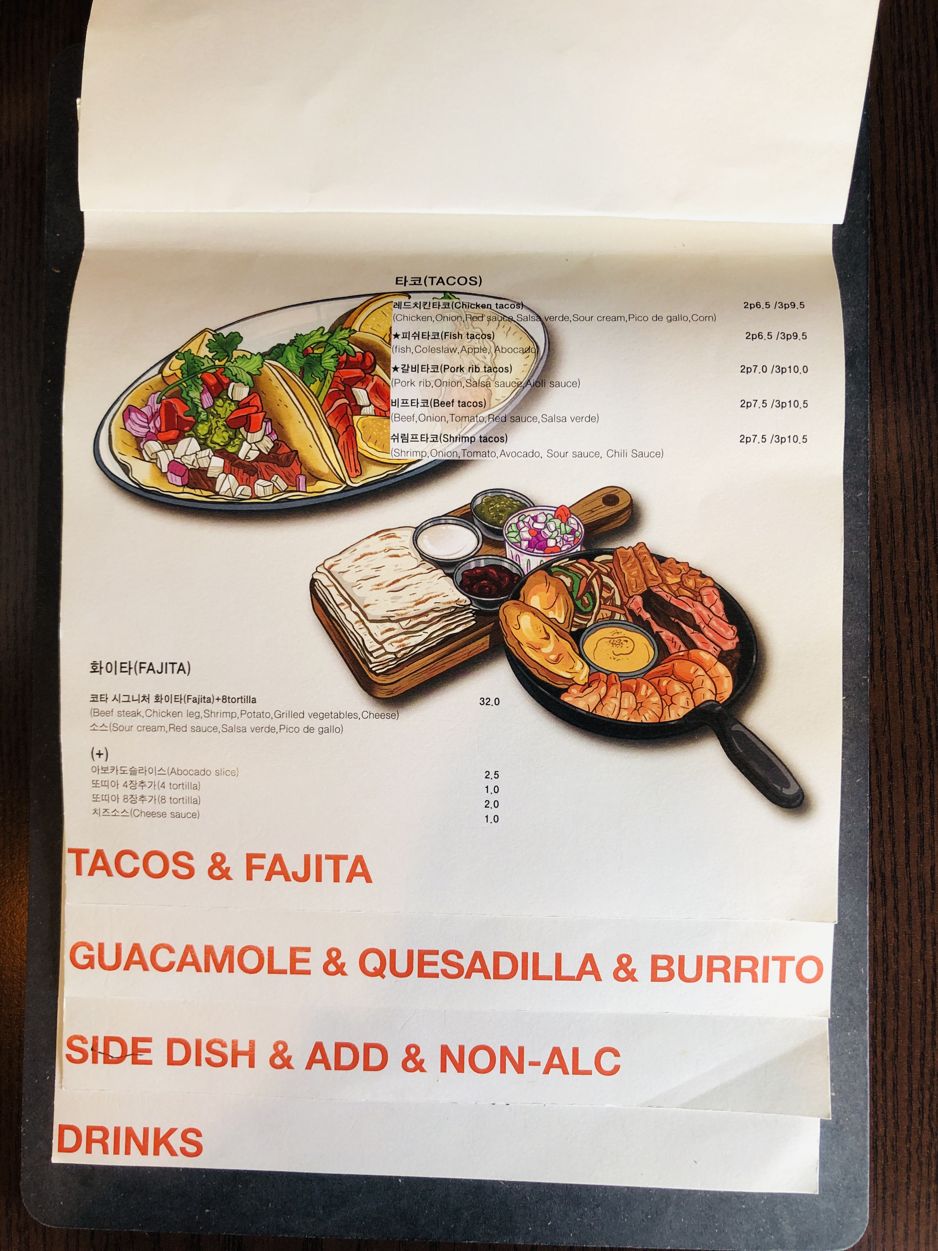 메뉴판을 보면 타코, 화이타, 퀘사디아, 브리또, 과콰몰리, 칵테일, 맥주, 음료 등 다양한 음식을 팔고 있었다.