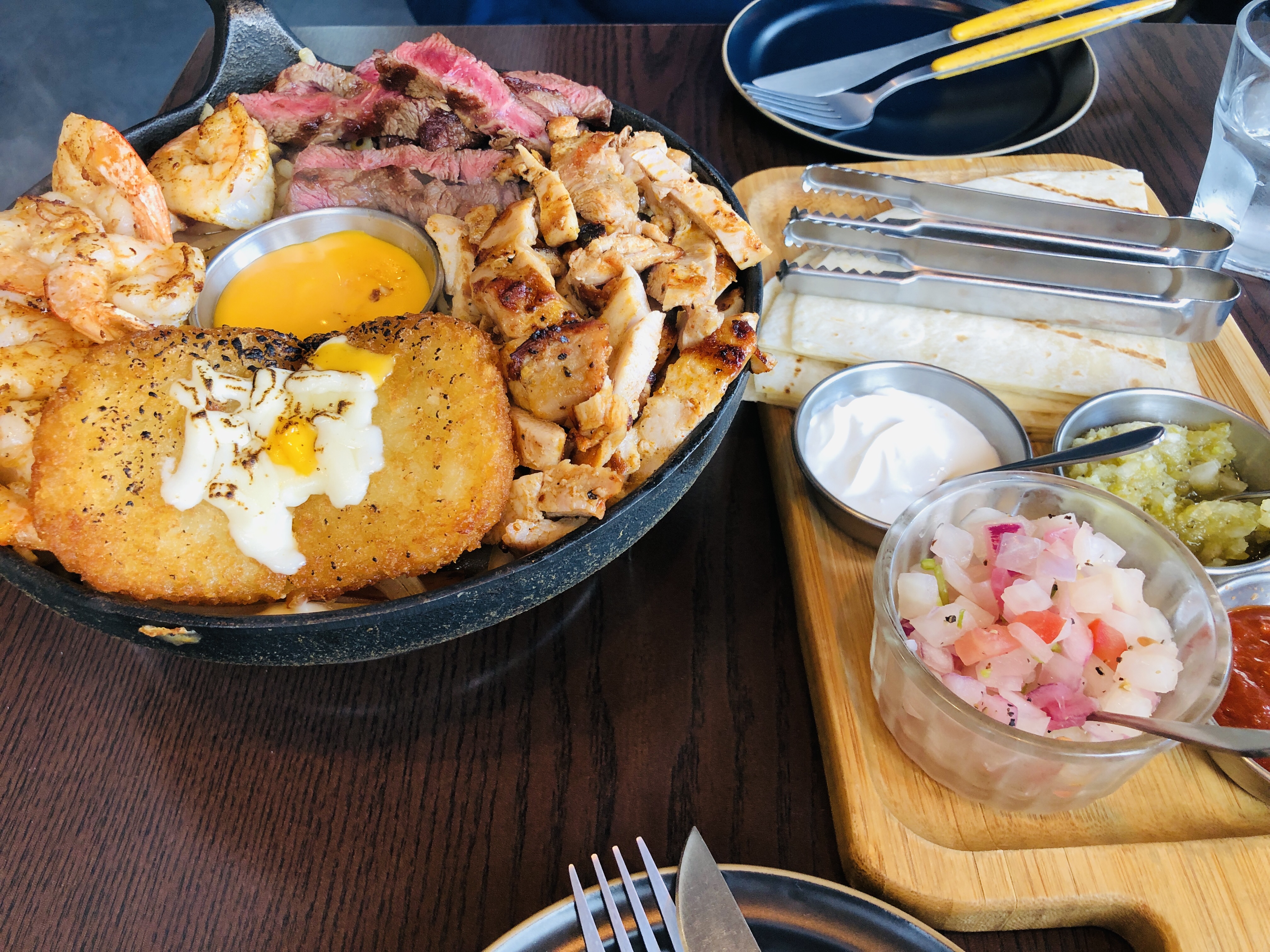 화이타에는 새우, 소고기, 닭고기, 해쉬브라운, 양파, 또띠아, 각종 소스가 나온다.