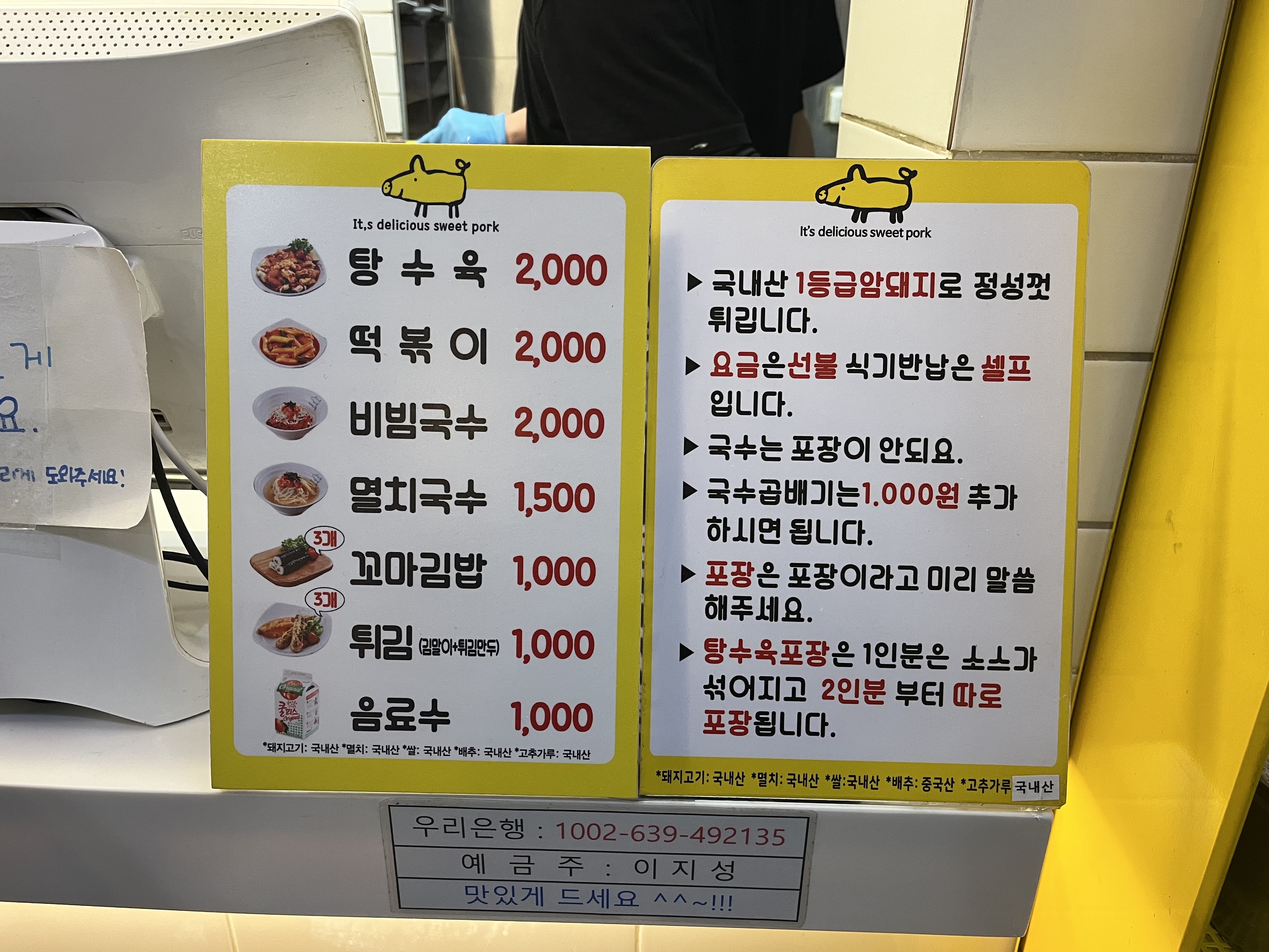 | 탕수육 2,000원 + 떡볶이 2,000원 + 비빔국수 2,000원 + 멸치국수 1,500원 + 꼬마김밥 1,000원 + 튀김 1,000원 = 총 9,500원! |